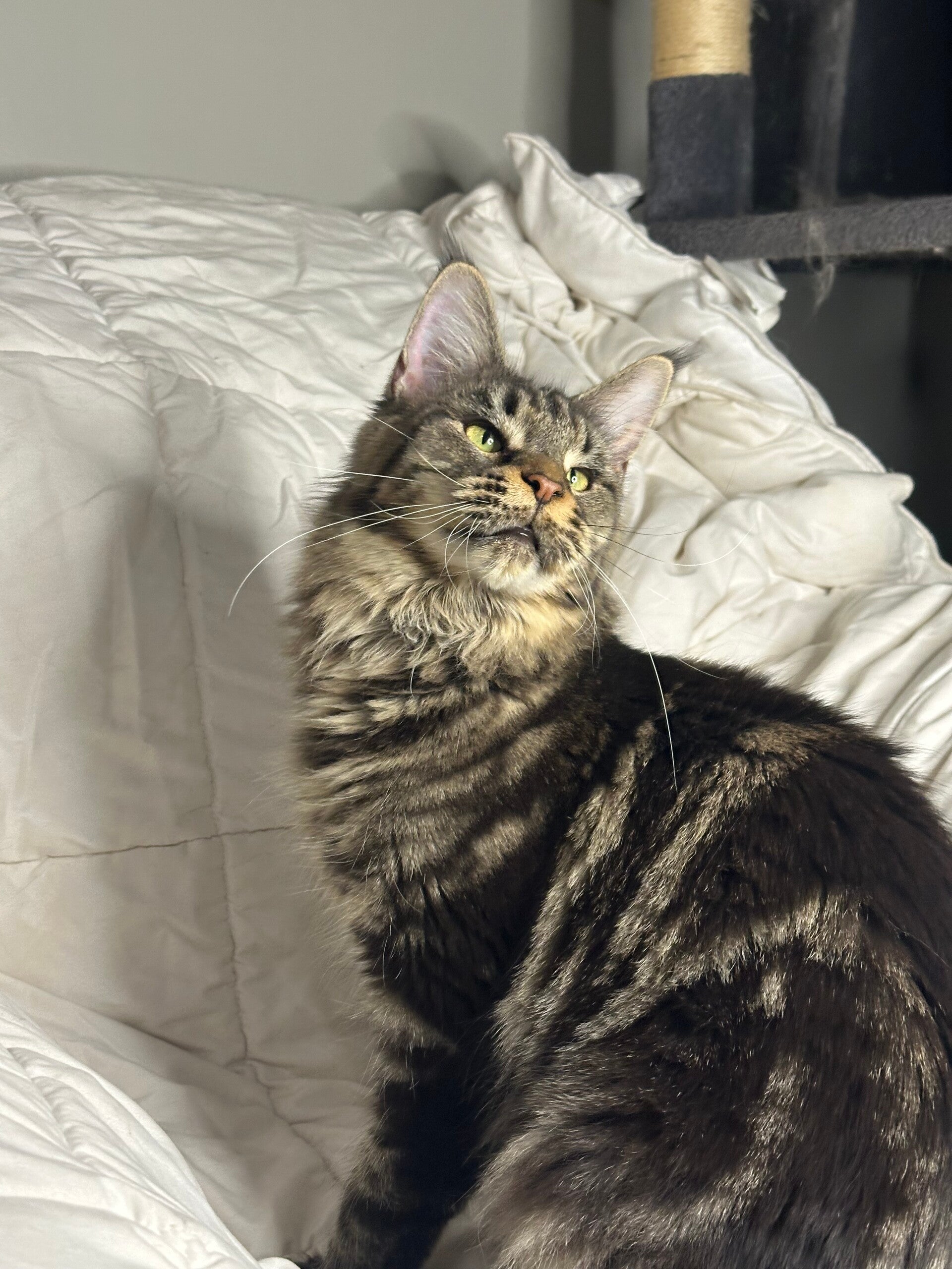 This is One Hot Jamocha. She will be 2 years old on March 19. Jamocha is a beautiful brown classic Maine Coon. She has one more to finish growing and maturing. Once being spayed on April 9th, she will be able to put all of her energy into growing and not the hormones. Jamocha has one of the easiest coats to take care. It is slick, soft, and so far has not matted. She is good with having her nails trimmed and being brushed. She is the alpha cat in my house. Jamocha has been running my house since I brought her home the summer of 2024. She has the three border collies under her paw. There is nothing I can do in the house without Jamocha right there to supervise or help - dishes, shower, vacuuming (as a kitten she used to ride the Rumba) and anything else. When I sit down, Jamocha is right there waiting to be held, petted, or just lay on me.